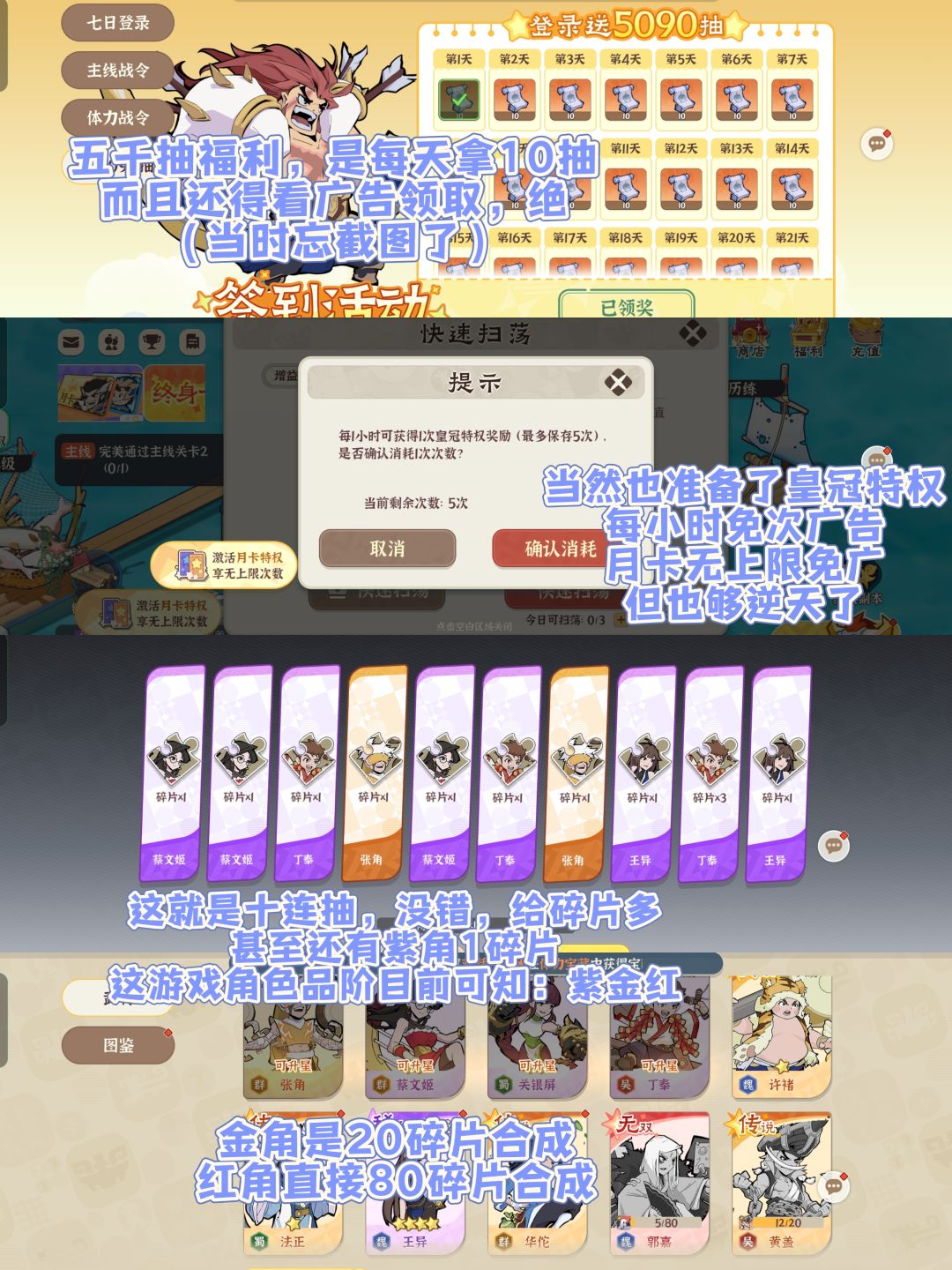6.福利活动挺好笑的,说是送5090抽,但是每天送10抽,而且还需要看广告领取,这又是一个毒点所在——还专门安排个皇冠特权,也就是限次免广:每小时可以积累1次免广、上限5次,你猜猜游戏中安排了哪些其他需要广告的点:资源、角色阵亡复活、快速扫荡等等。