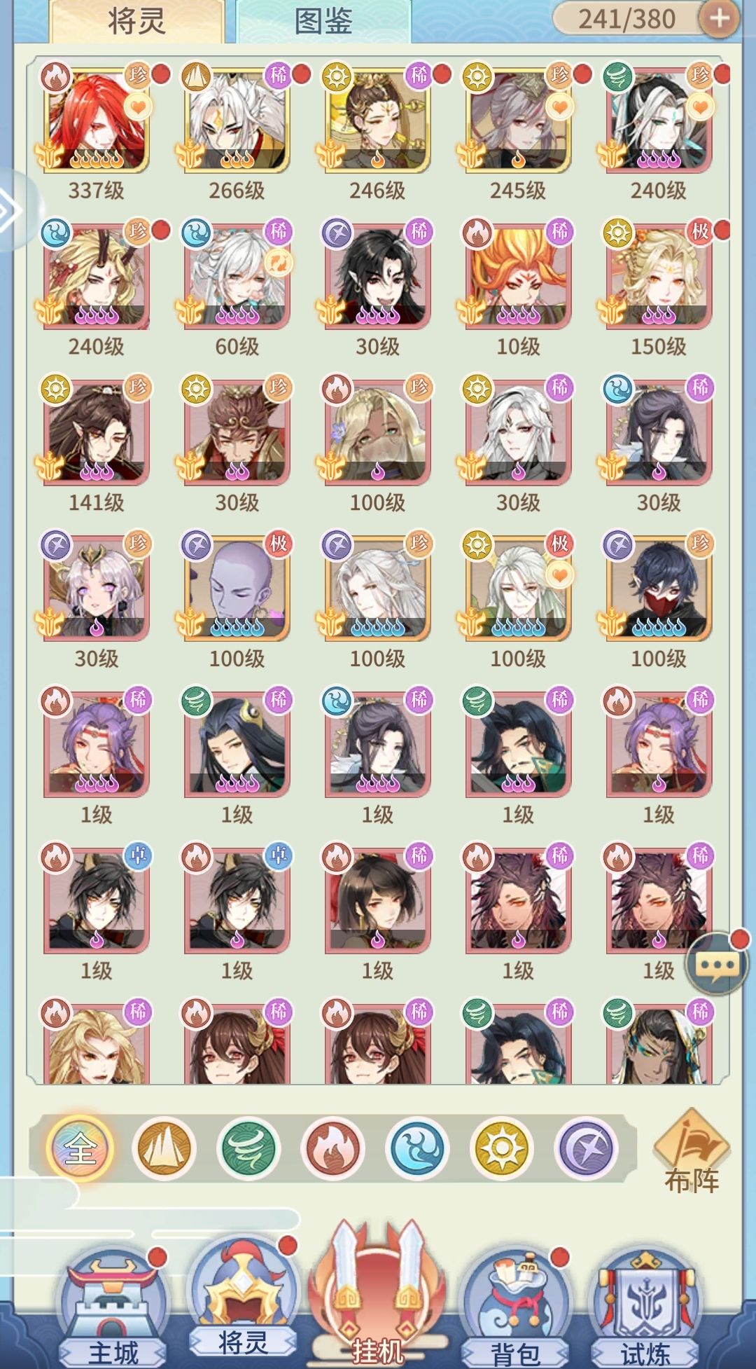 角色及养成:大部分角色都挺好看,为小凤凰爆灯!第三张是我box,可以看到有属性和稀有度之分,究极将灵好像都很强大吧,而且都是阴阳属性,获取难度和升星难度大。升星不同阶级所需要的材料不同,反正基本就是需要同属性狗粮和本体,最高是升到14星。随着等级提升,耗费的材料也很多,拉长了养成周期。然后究极将灵比普通的多了一个天赋就是“资质”(其实没注意其他究极有没有),反正加数值了应该是。
