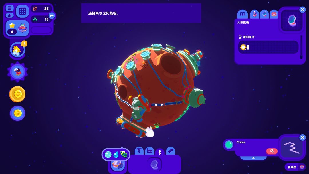 游戏的玩法非常的简单,完成规定要的采集/制作任务即可。采集任务非常简单,对目标星球进行扫描,发现这个星球的主要资源,进入星球,安装采集和发送塔,用运输管道将采集器和发射塔链接起来,就会把采集好的资源打包好发送到发射塔,发射塔又会向主基地发送运输货物的火箭,完成简单的初级资源采集。