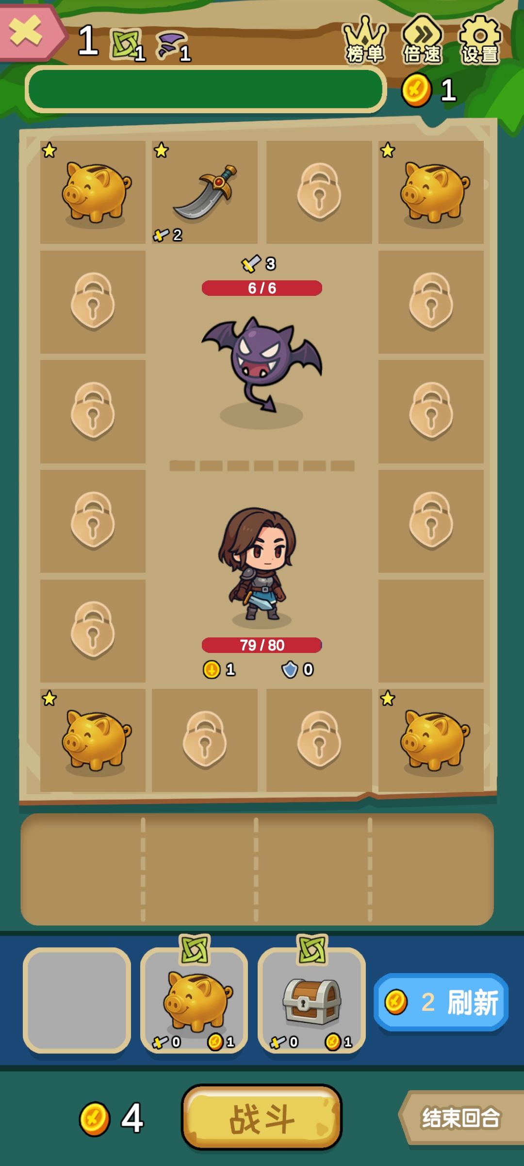 做工品质不高,三星友情鼓励。玩法是轻度游戏设定,内容很单一,战斗是回合制的,点击战斗开始随机抽选格子,若抽到武器可以对怪物进行攻击,抽到资源可以选择再抽,没有金币进入下一回合,直至消灭怪物晋级或被怪物干掉。