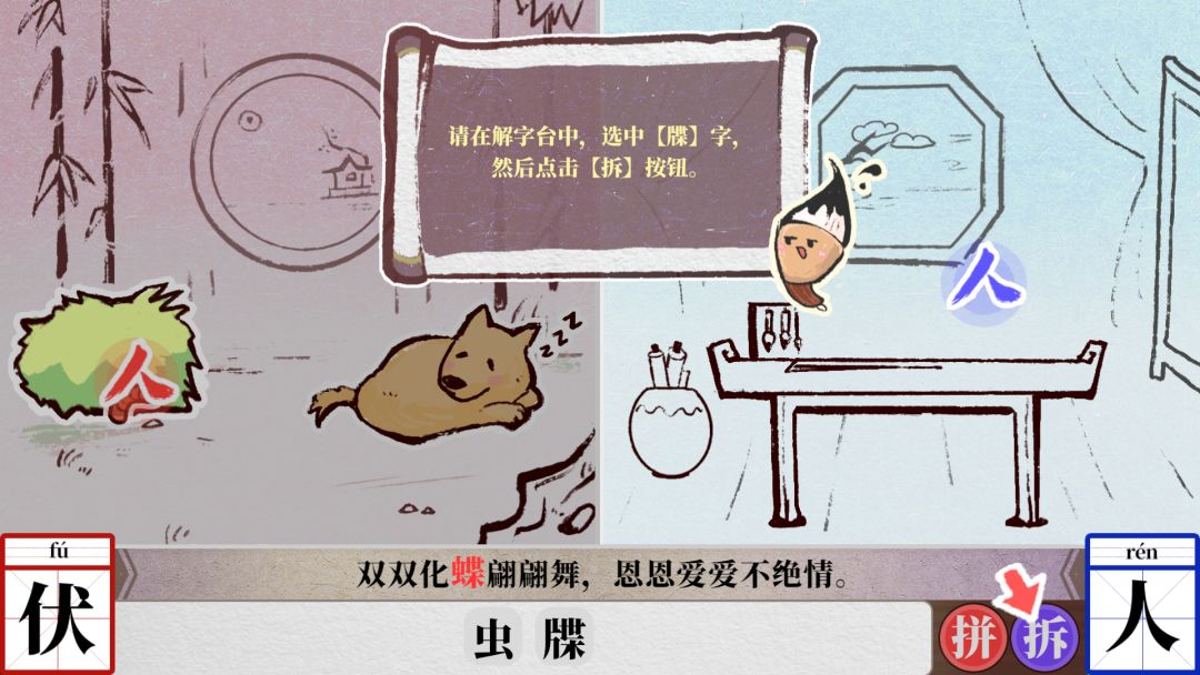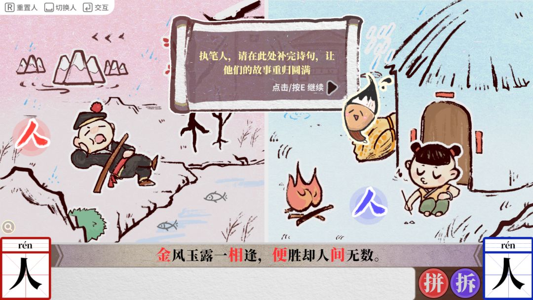 她们的设计落点体现在双人成行中的“人”,通过控制两边的“人”字,与场景中的元素结合成以单人旁的新字,用新字来完成场景的解谜以获取文字,然后将获得的文字进行拆解重组出通关所需要的字。