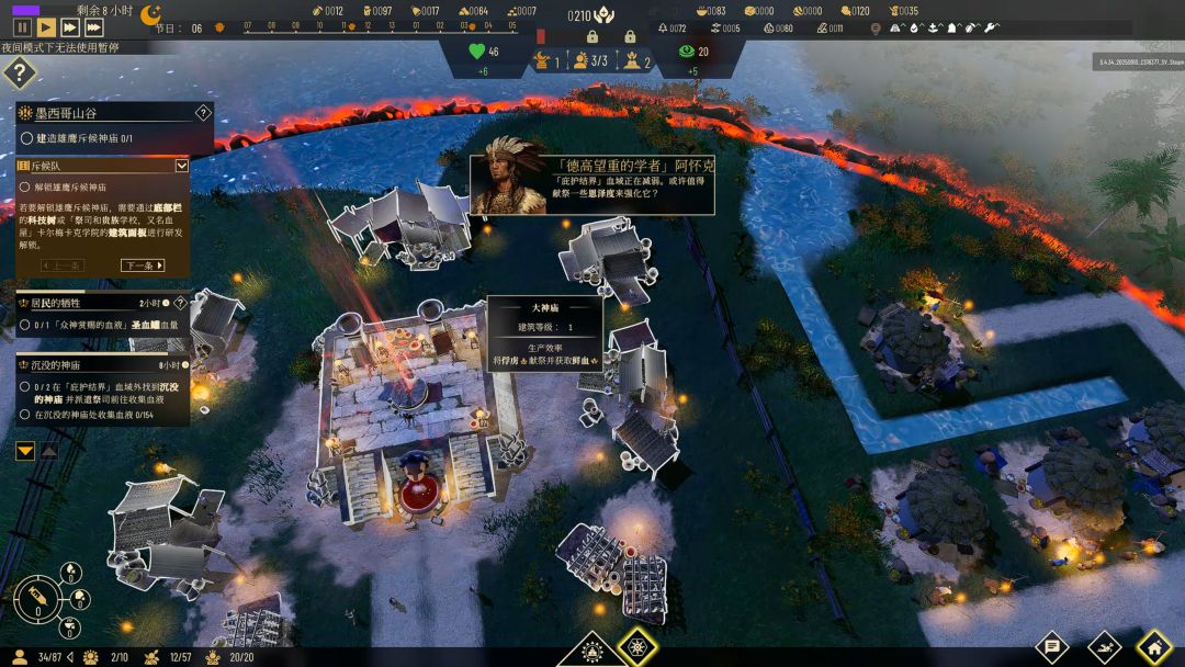 本作另外一个特色的要素就是独特的阿兹特克神权系统。献祭鲜血可以提升太阳的好感度,同时解锁各种与生产生活相关的庇护,但不能一股脑的把人都献祭了,要达到可持续的竭泽而渔。所以本作的主要玩法就是白天发展建设,晚上献血抵御黑暗入侵。