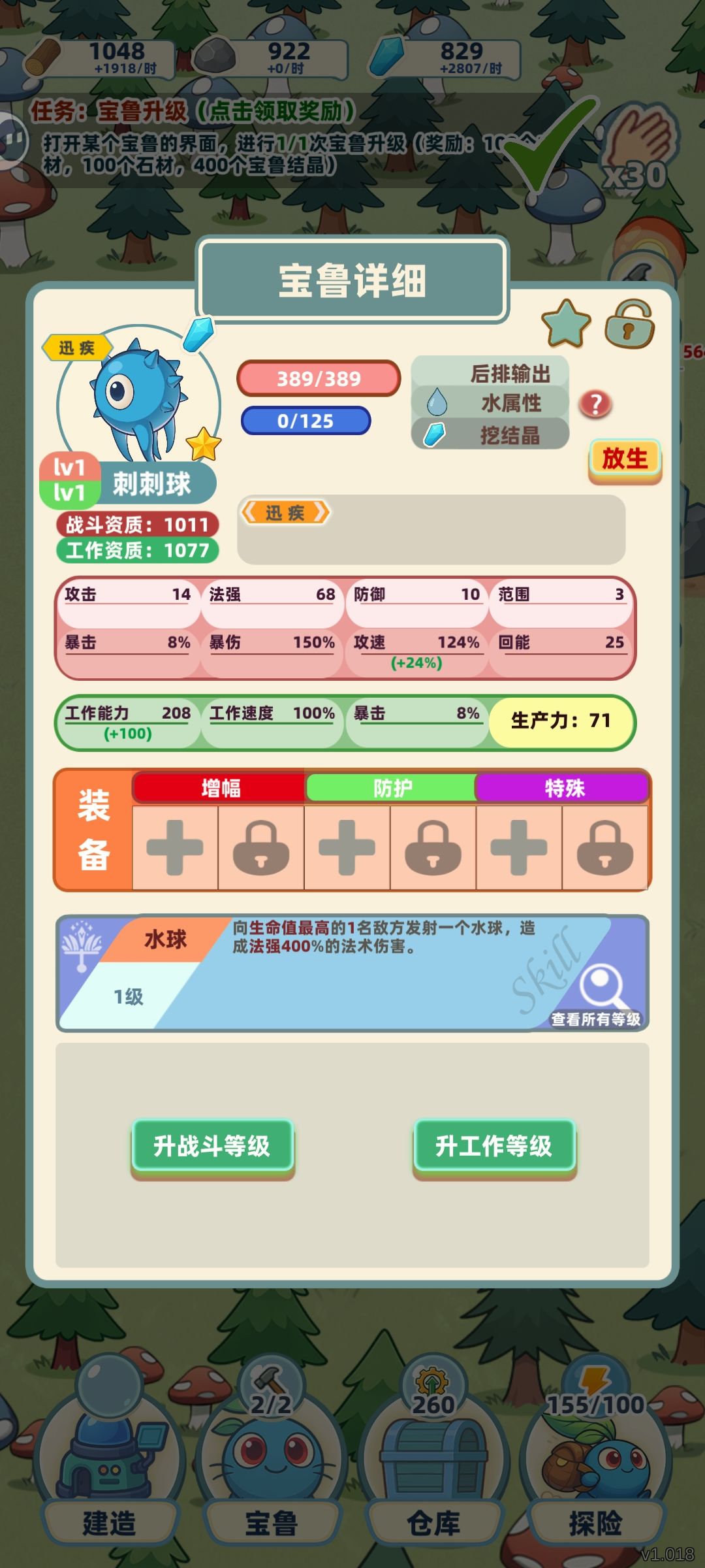 宝鲁种类很多,每一种宝鲁与产出资源绑定,让其工作只会获得这一种资源。出战和工作数量由建筑决定,战斗有近战和远程攻击方式差别,存在少许组合搭配策略。单只宝鲁有战斗和工作双重等级,从字面意思就很好理解,教学也有提及。另有装备和技能等级养成,解锁稍慢。