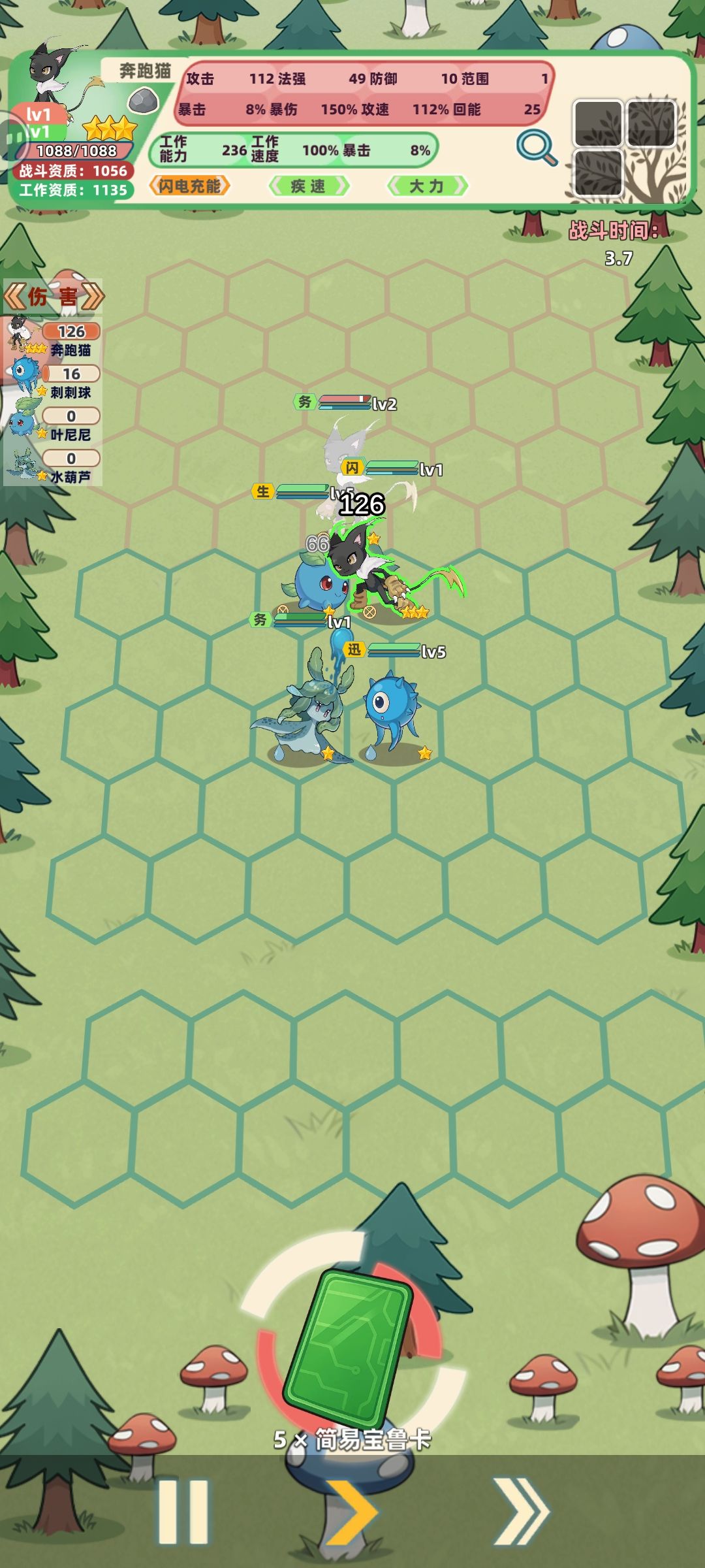 战斗表现同自走棋类游戏,可以在一定范围内布阵,宝鲁也有能量属性,攒满放大招。特效效果有一些,但不是很夸张的程度,意思表达清晰易懂。