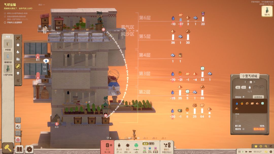 但不要一味向上扩展,还需要注意资源的产出和人口管理,每一次塔身都可附带各类设施,诸如露水收集站、沙尘收集站、种植园、木材厂、砂砖工坊、玻璃厂等。