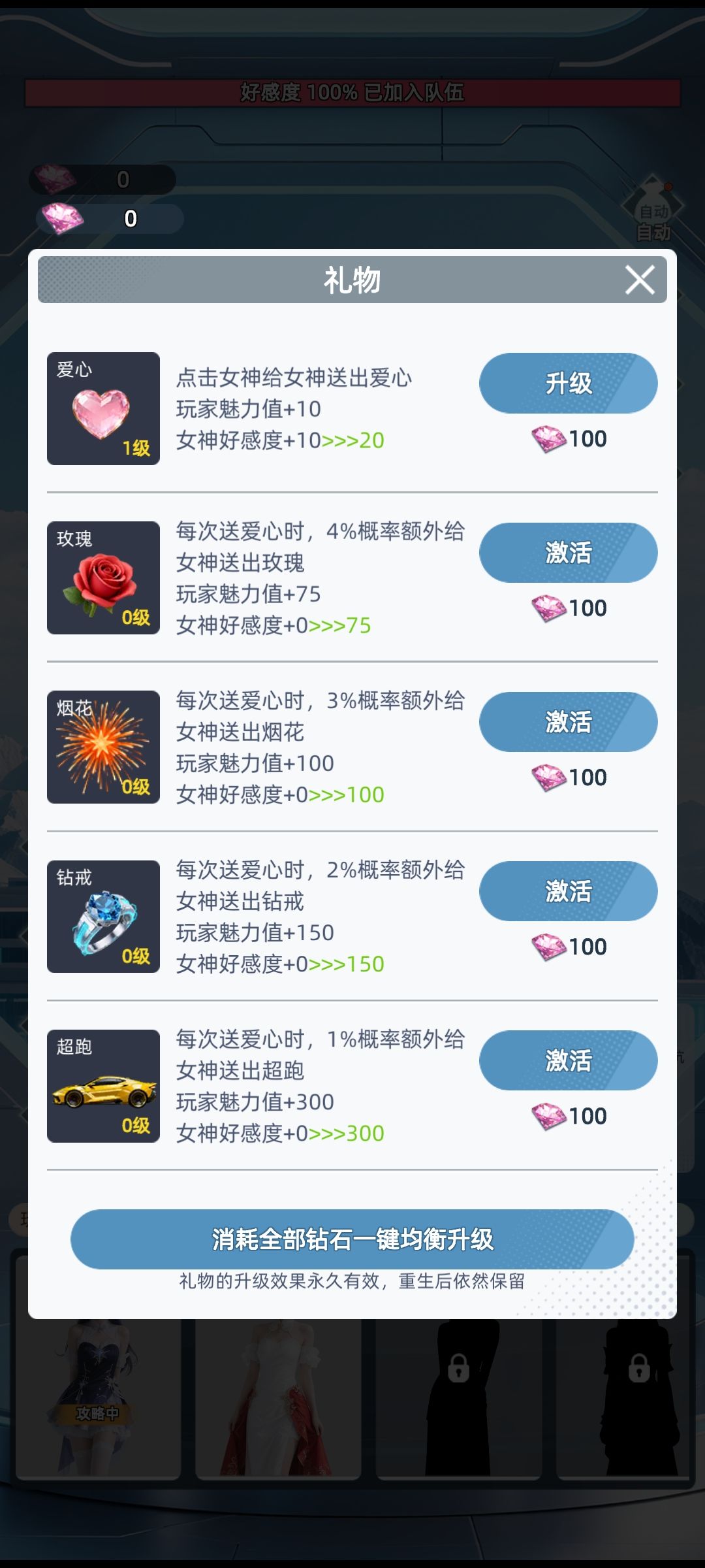 收入女神越多,下一个的点击难度越高,数值卡点的体验很明显。此时需要重生来变强,功能上同很多放置类游戏差不多,不断重生叠数值来增强,是养成的主要方式。