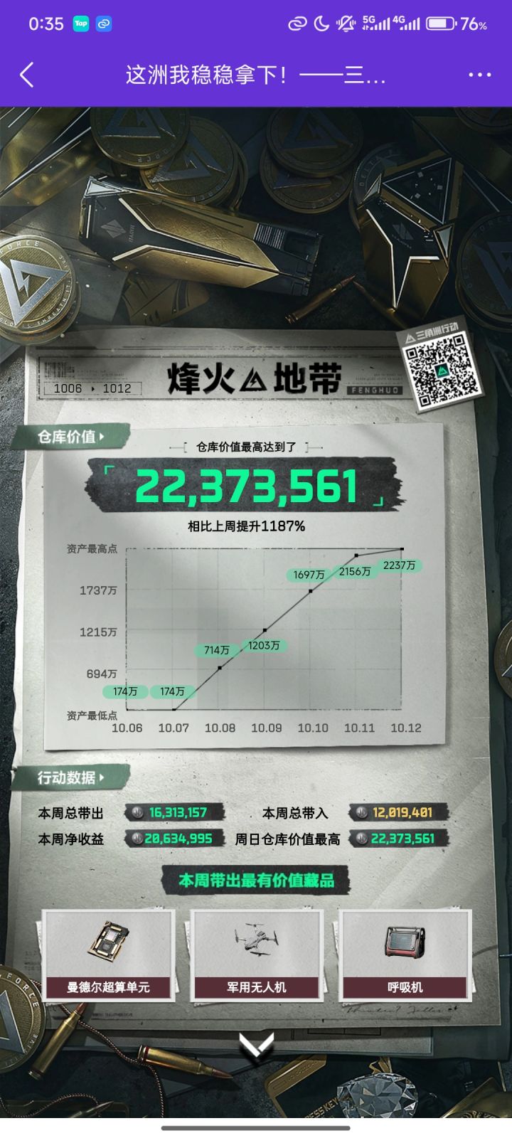 这个是最重量级的,我拿着搜出来的五甲四头紫挂紫包紫蛋满改枪进机密,因为不熟悉点位做破壁任务的时候被抽死了,估计是在房区那边的高地起狙,我这边没脚没声纹,一枪倒地,