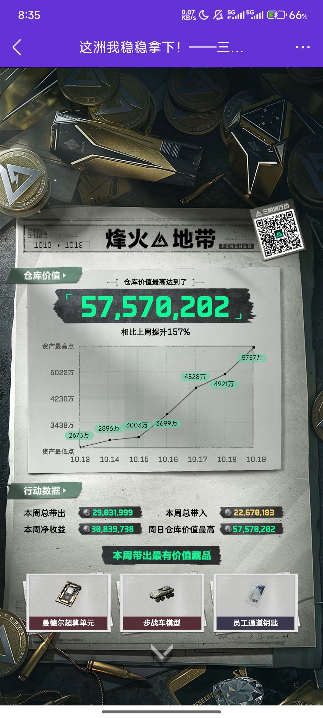 我第四把出了曼德尔超算,听说还挺稀有的,目前仓库有五六个红,只打过大坝长弓巴克时,普通机密。整体可以接受,我不清楚常规爆率,我基本上普坝是三四十万,机密是六七十万,黑夜跑了两把百万撤离。