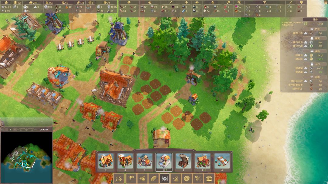 如果要探索更远的区域,就需要先在建造警卫塔来开视野,然后在视野范围内就可以造建筑和进行资源开采了。资源的开采都有对应的收集建筑,开采出来的资源也都有对应的加工建筑,比如木材对应的这两类建筑就是伐木场和锯木厂。随着资源的收集,我们就需要建造各类功能性的建筑了,一步步完善城镇的各项职能,才能进一步发展生产力,为之后的战斗与贸易做好准备。
