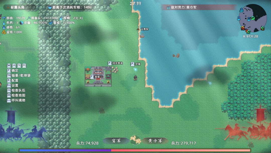 关于游戏的打,是在大地图中主动或者被动触发的战斗,大地图上的敌对势力发现玩家的视野非常的大,看见玩家就开始紧追不舍,而且还不好甩掉。在进行战斗前也有一些有限的策略可以使用,系统也会对敌我双方的势力进行比较,是否开战,这打不过可以丢掉一些物资跑嘛。在进入战斗战场后,玩家可以控制主角,wasd控制移动,鼠标左右键分别是攻击和防御,空格闪避shift奔跑,还可以更换武器和对军队进行控制。战斗也有武将单挑,斗将的环节,在1对1的场景下,精准防御也有类似弹反的效果,可以说可玩性非常的高。最后就是胜利的搜刮战利品,也是发动战斗主要的目的。搜刮的各种物品最终都是为了换钱,换钱则是为了招兵买马,扩充自己的实力。战斗胜利了也有感悟点数,感悟可以用来学习技能,在战斗的时候效果都很不错。
