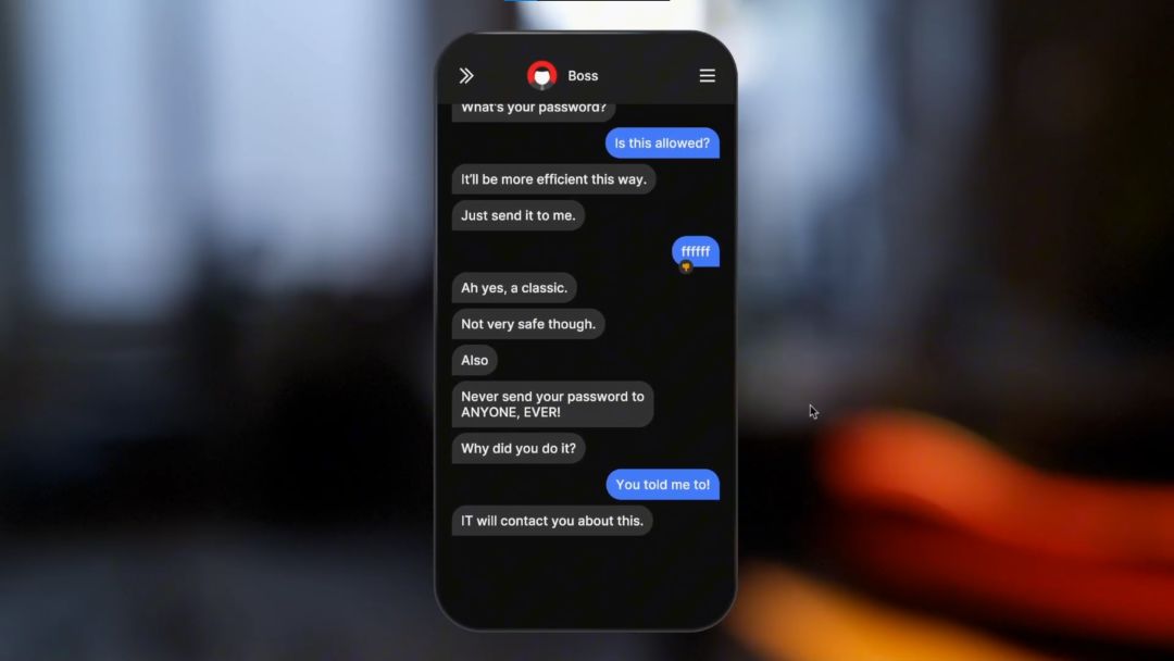 老板说话起来很有老板的样子,上来就是要你做事。图表刚修完,就赶来问进度,做评价。没过多久又发来消息,要你做新的图。这老板不仅会用文字消息来点评你的工作,还会在消息上贴❤、👍、👎这些emoji来表示自己的好恶。你叫他老板,他回复说自己很喜欢你直接称他为老板,也是个有话直说的人。聊天回复是有选项的,你当然也不必对老板惟命是从。就算是说自己没完成工作、不知道他在问的是什么东西、没空处理工作、不擅长处理电脑,老板也不能奈你何。有时候就算是顺着老板的意思来,你也一样会被骂。老板向我要密码,一连问了两次。我同意后输入密码的时候,想骂人又没直接骂,最后输入了密码“ffffff”,最后却被老板说,这个密码经典简单,不太安全。被质问后说指责我不应该随便把密码给出去,之后还要找我聊聊这个问题。(╯▔皿▔)╯