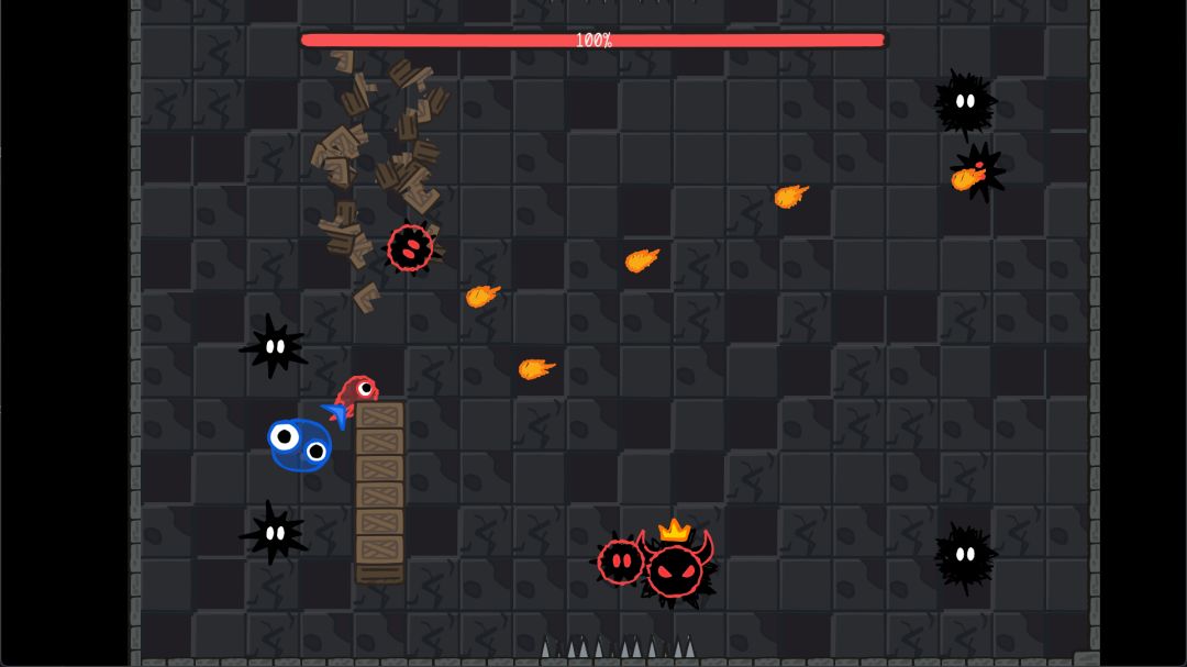 游戏难度个人觉得还好,属于有些挑战但不会让人感受到棘手的那种。敌人类型多样,包括近战、远程和需特定方式击杀的“红圈怪”,1-Boss战需利用环境互动。关卡设计对于48h设计来说还挺好,其实我有些怀疑制作组是不是有过制作此类游戏的相关经验。