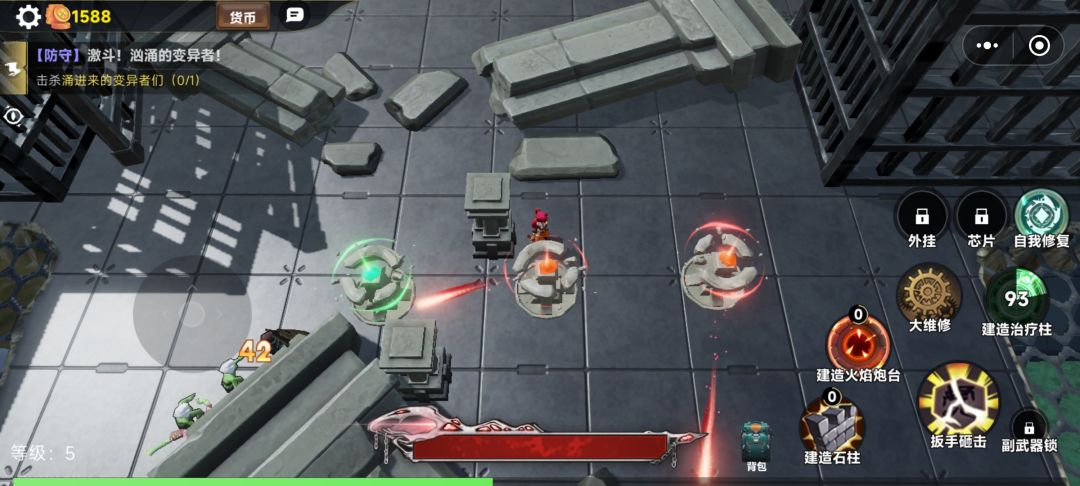 核心战斗是平面战斗刷宝,战斗全程需要手动操作,因手上装备武器不同,战斗风格迥异。如手枪是远程点射,扳手可以建造不同的防御塔等。同一般商业化游戏一样,前期主线推关进行剧情,功能逐步解锁,内容量其实不少。