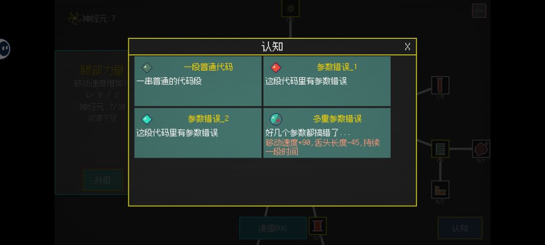 有外围养成,是一个结构很庞大的多重分支,点亮需要消耗神经元,即bug产出。游戏内吃bug需要有选择和行动策略,以达到单局限时内最大收益。