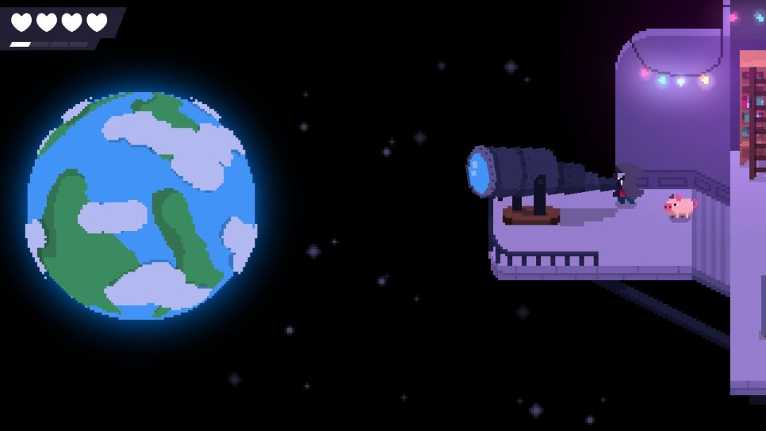 这种慢节奏的生活配上游戏的像素风,给人一种惬意又自由的感觉。有些动作特效也能反映出这种惬意,比如爬梯子的时候小猪会爬到主角的头上。传送门的动画过场也很精美,一人一猪仿佛在冥河中流淌的样子。