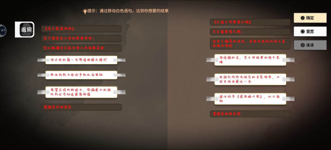 是一个类似Will美好世界那种,通过变换文字顺序来改变事件结果的游戏。但是流程真的很短,只有三关。而且文字有时候顺序变了以后,逻辑以及人称等等方面会很奇怪,不是很通顺。只能说是呃……比较拙劣的模仿。剧情方面,就是通过改变文字顺序改变日常生活中的不如意,但偷懒不做卫生什么的………总觉得不太好………明白你想写出爽文的感觉,但我觉得一定程度上的积极的立意最好也要有……
