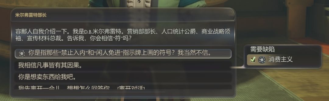 另一个优点应该就是它其中大量的文本对话了,作为一款CRPG游戏,我们有相当广阔的自由性,你可以直接全程杀光看到的一切NPC(并非一切,杀错了可能会卡剧情)也可以当一名谈判大师,全程靠嘴炮拿下敌人(取决于你的属性)而你最开始选择的人物背景都会影响到后续NPC的对话,教授初始智力高,可以触发一些理科生独特的对话,而打杂背景(乐子人必选❗)则会出现一些看上去相当抽象的对话选项🤣(甚至有人还研究出了“弱智流”打法🤣🤣)