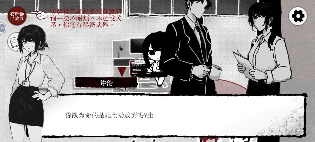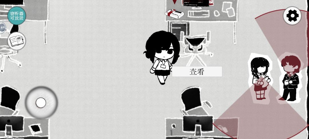 搜集线索进行案情还原的侦探模拟游戏,线索收集的过程不复杂,一些道具很明显的摆在场景中,只需交互一次即可收集到。员工之间的谈话稍微复杂点,需在附近放置窃听器,几秒钟后即可收集到情报。员工有自己的视野范围,像盟军敢死队的敌人设定,但不会自己移动,放窃听器的操作比较简单。