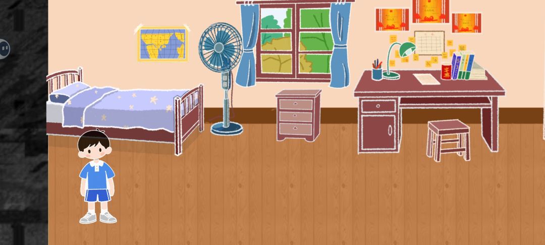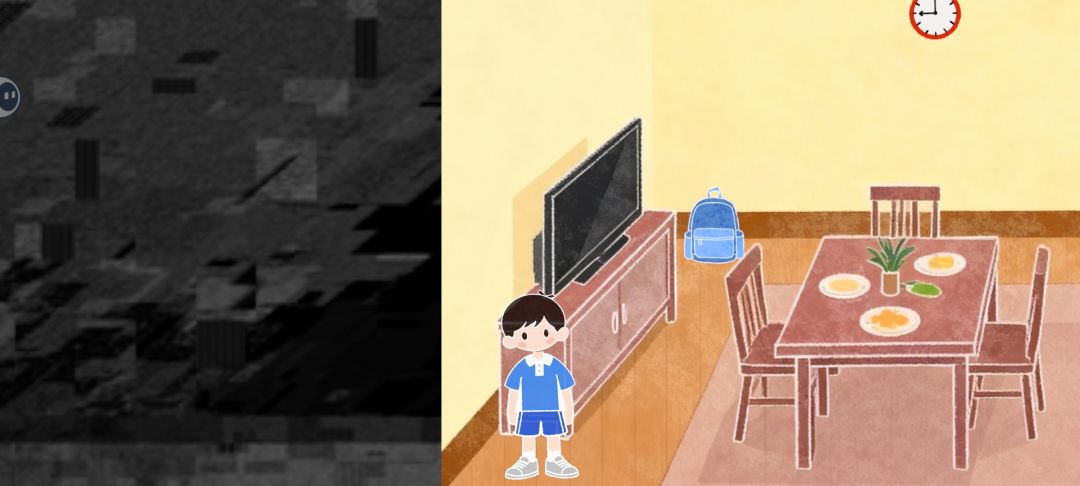 2D卡通画风,有点像简笔画效果,大部分场景都是静态图,点击交互后出现文本提示,以及线索道具。UI基本没有,持有道具靠脑子记忆,设定虽然很新奇,但易用性并不好。小明形象设定很像小学生,不走路状态下会晃脑袋,看起来有点傻。