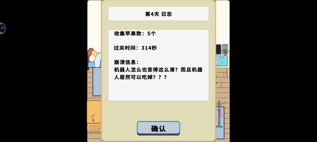 核心规则本质上是推箱子,在此基础上进行了一定程度的规则变化,吃掉三个苹果才能打开通往下一关的入口。然而,随着关卡的推进,苹果遇到了各种bug,还真是越测bug越多,有些时候需要利用bug才能顺利通关,有一定挑战性。有简单的新手教学,以剧情文本的方式进行简单提示,上手不难。