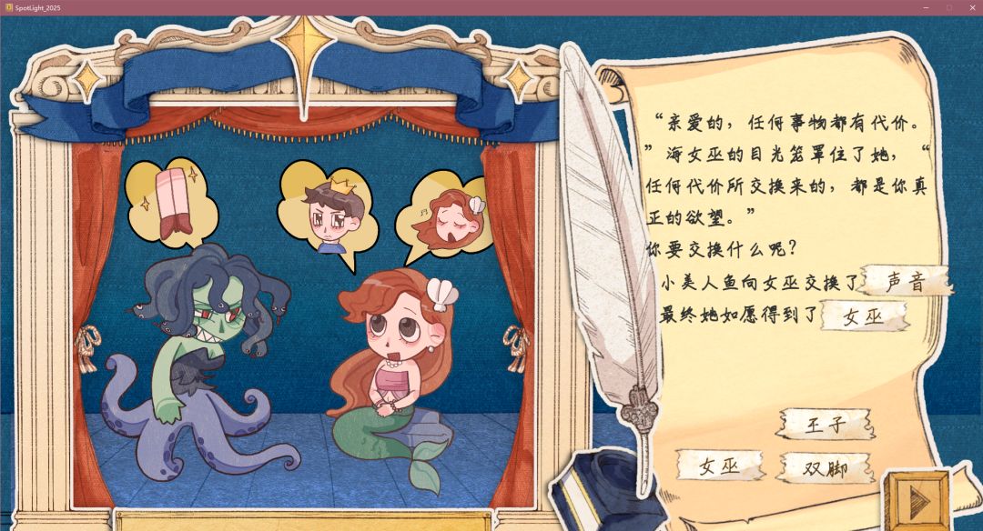 题材设定比较符合聚光灯主题,不同的词条产生不同结果,有些让人啼笑皆非,有点怀疑是不是BUG的感觉。剧情设计非常有趣味性,有些结局让人眼前一亮,给不同童话故事赋予新的生命,换个角度看问题果然不一样,发散的点很好。