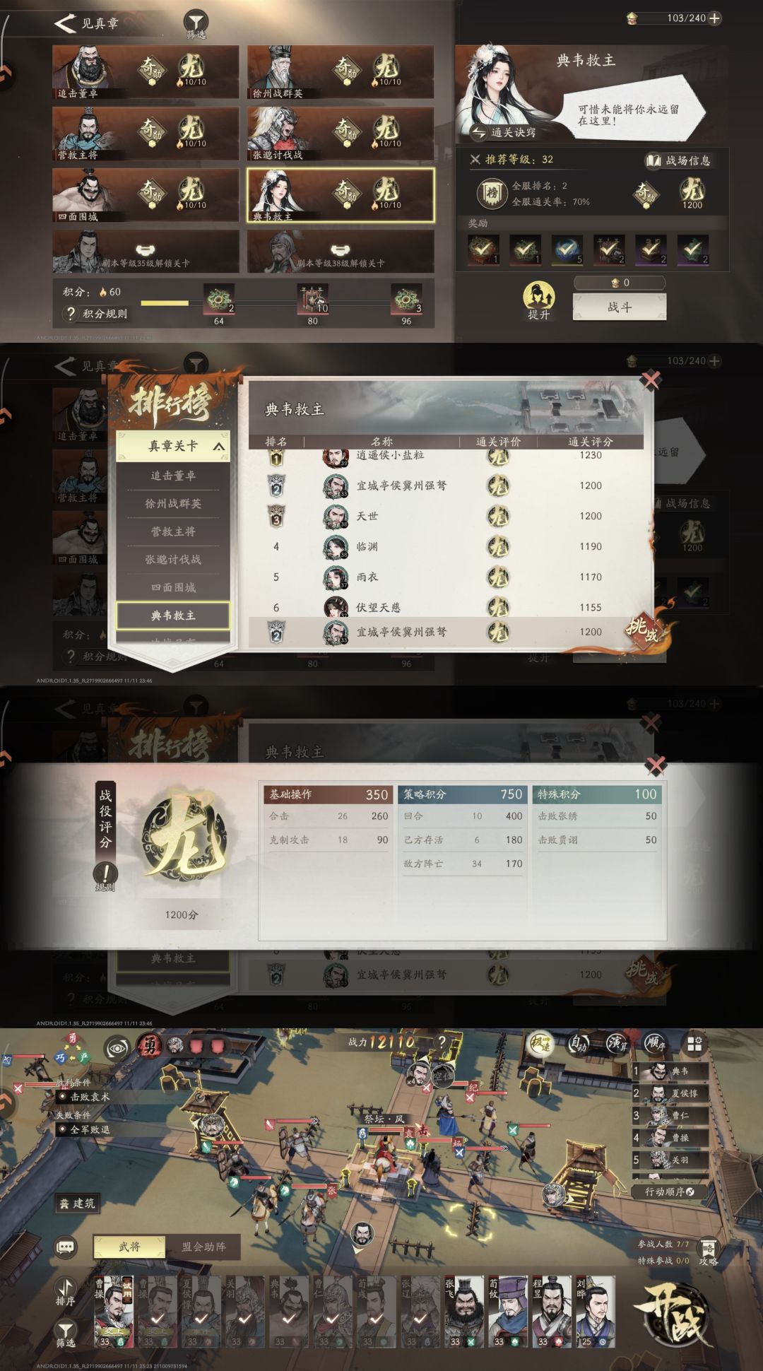 照例三张图防伪自证身份,找了个开服3天的老区自建号中等强度(对战棋游戏来说大概是每天手操1-2小时左右)玩6天,凭游戏理解完全可以在非pvp场地混战评分基本可以跨5级以上杀进榜单前列(注:p3中前三张战绩图和最后一个局内对战不是同一场战役,最后的战役只是咱在感慨一场战斗还可以上阵7个武将)。