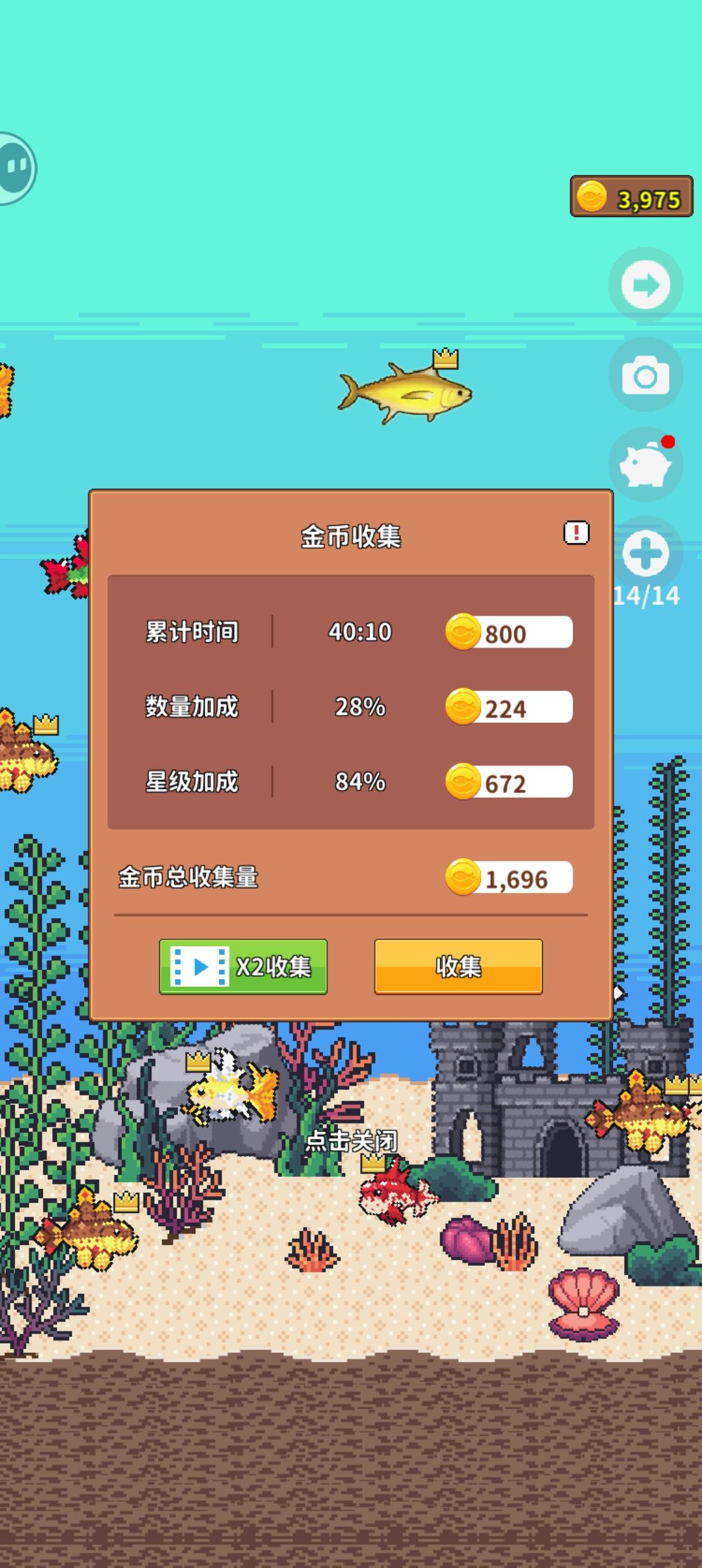 鱼缸的话,我感觉非常之好用啊,鱼缸里的鱼星级上去了,离线收益非常之多。我有一次离线收益居然有10k!!!这个是之前的图,我现在鱼缸有21条鱼🐟。