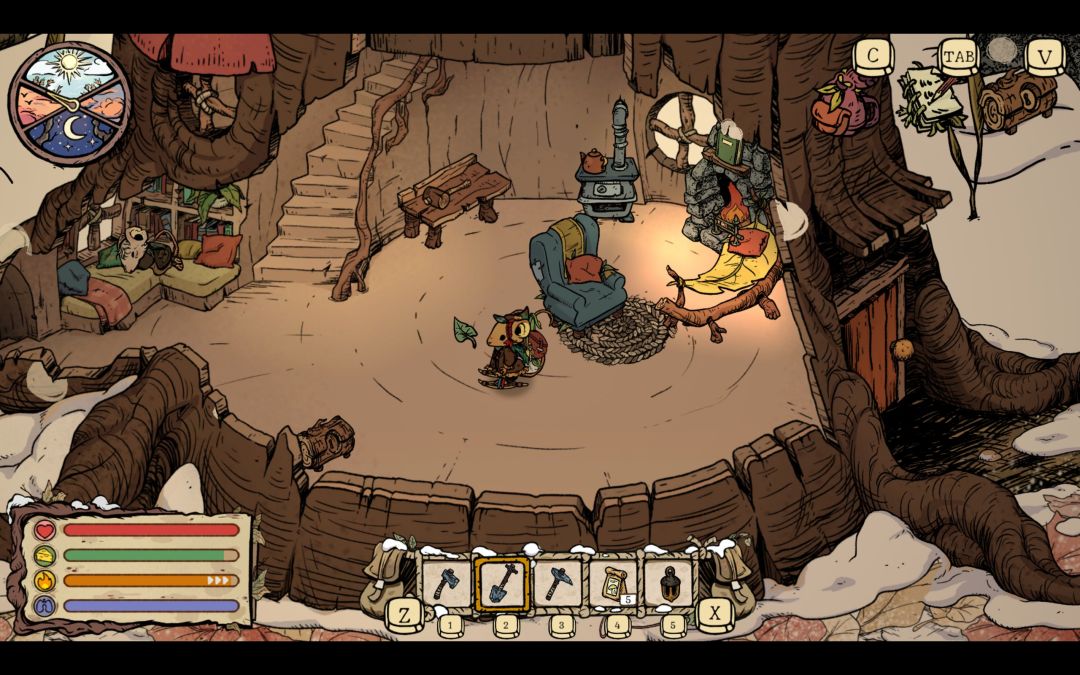 身处严冬,小老鼠每次外出都必须注意保暖,游戏分为白天与夜晚两个阶段,偶尔还会出现极端天气暴风雪。在夜晚或大雪天气中,小老鼠的体温急速下降,需要依靠篝火或吃食物恢复体温,高品质的衣服也能增强一定抗寒值,但终究不是权宜之策。在我实际体验中,每到夜晚通常都会选择回家睡觉,一方面是在家中我们能为下次外出做一些准备以及规划,另一方面是小老鼠的背包空间十分有限,即便在剧情后解锁更多空间,对于我这种喜欢什么都想拿的玩家来说也是不够用的,需要时刻要回家存放,不过游戏的储存箱又是令我难受的一点,其主要原因是物品不会自动堆叠以及没有一键整理(至少我没发现),虽然储存箱里的东西可以随时使用,但当我们要找某些物品时会发现比较混乱,而且游戏的键鼠适配在部分情况下并没有那么舒适。