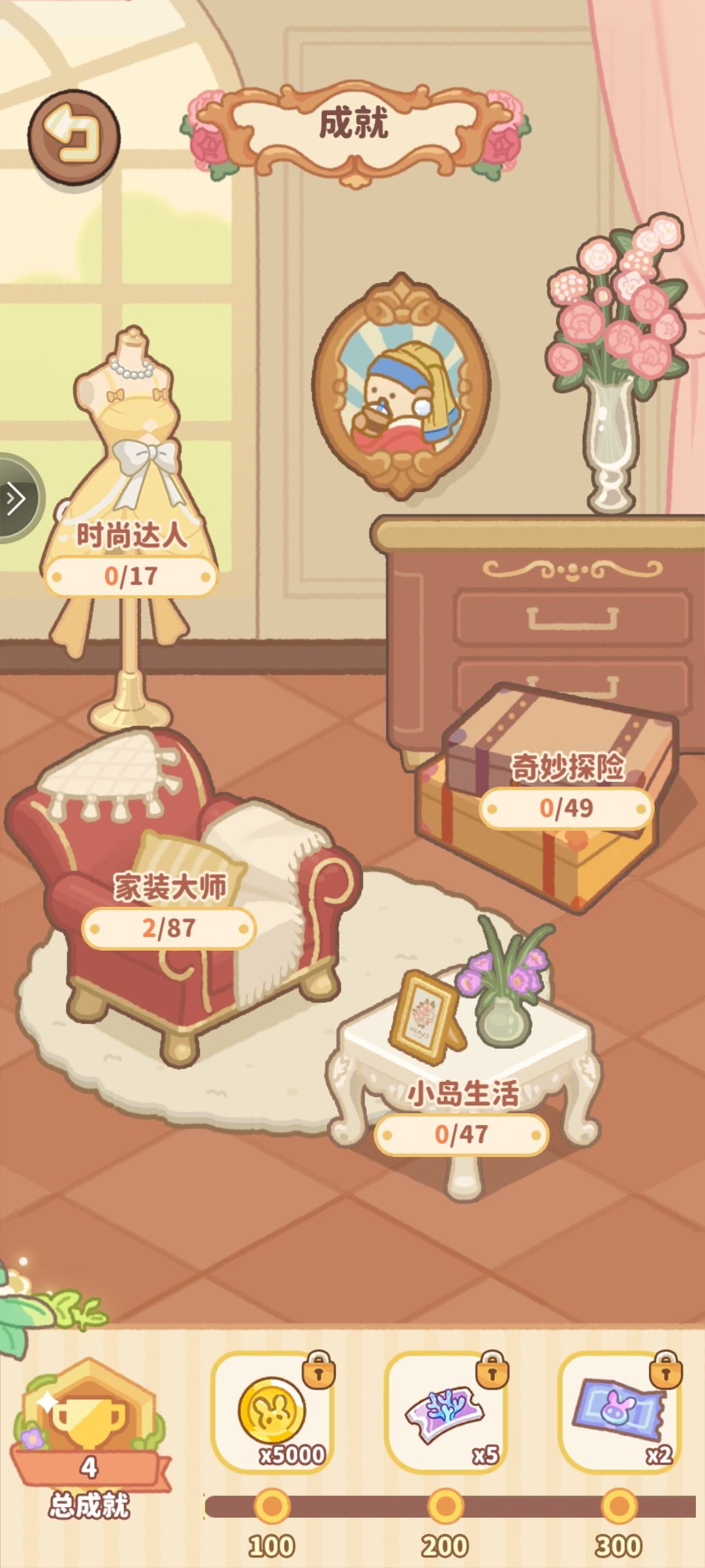 并没有数值养成内容,只有庞大的收集图鉴,以及成就系统。家具数量非常多,而且有主题特点,收集对于资金需求量很大。初期给了不少启动资金,但相对于庞大的收集数量,仍然微不足道。