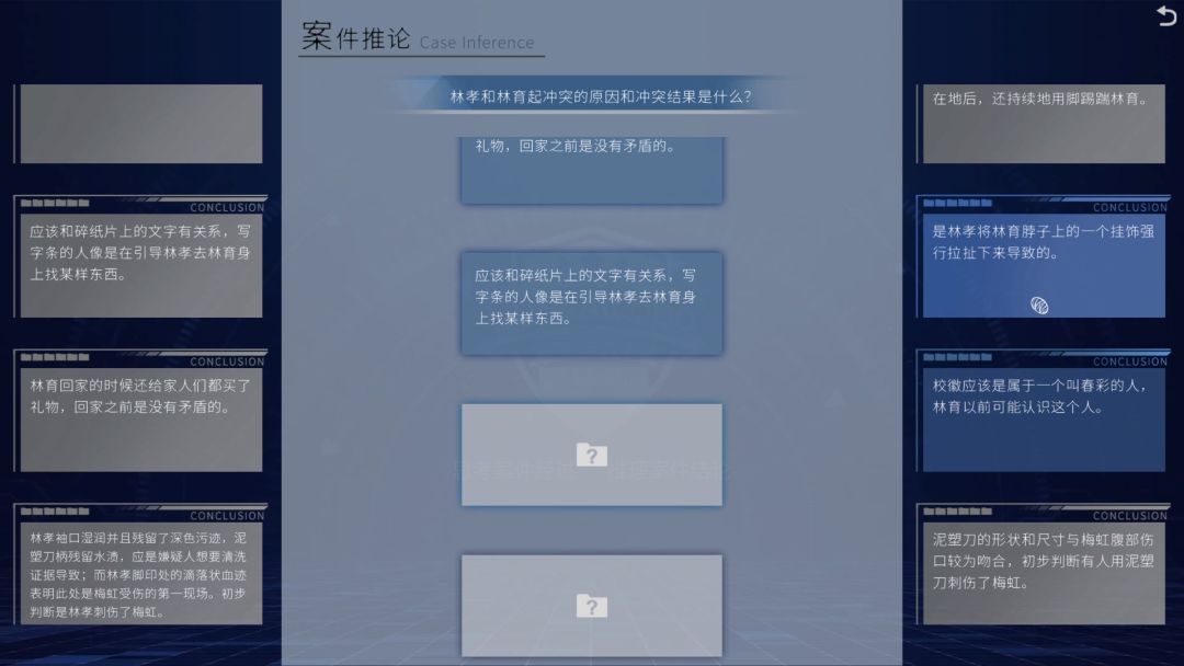 在收集完成后,就可以对现有的信息进行整合,整合的过程要对应到案件簿中的各种信息,如果不太清楚怎么对应,可以看右上角的灯泡有提示,按需匹配就行了。当完成一个信息的整合后,会产生一个新的信息整合,新的整合可能会需要新的线索或者是信息,这样可以当作游戏内的一个引导功能,可以明白自己缺了什么道具缺了什么信息。