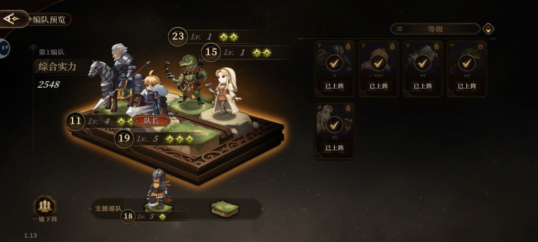 英雄总计39人,品级有R、SR、SSR三个档次,也有不同阵营和职业设定。最大上阵四人外加替补两名,看格子有六个,可能之后还可以解锁更多上阵位。