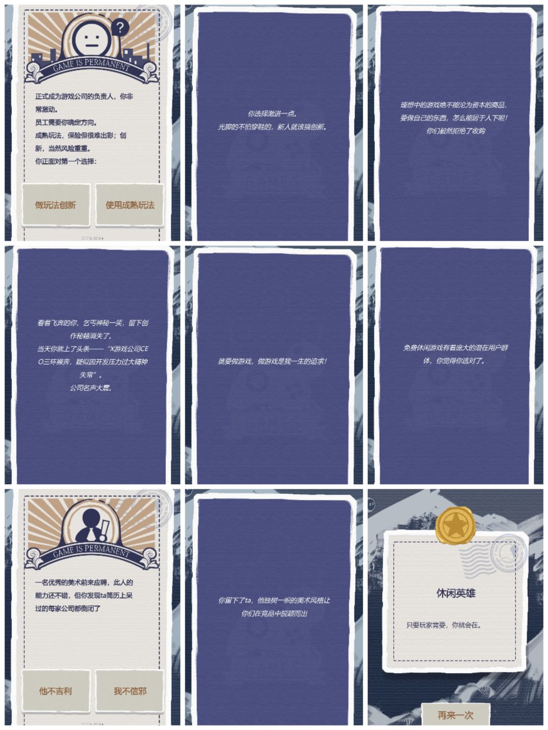 一张张图我感觉就是很卡牌,没有特别出彩,但是就是很卡牌,感觉特别适合桌游类。结局图鉴的图标很喜欢,是火漆的样子,之前迷过,所以还是很喜欢的。