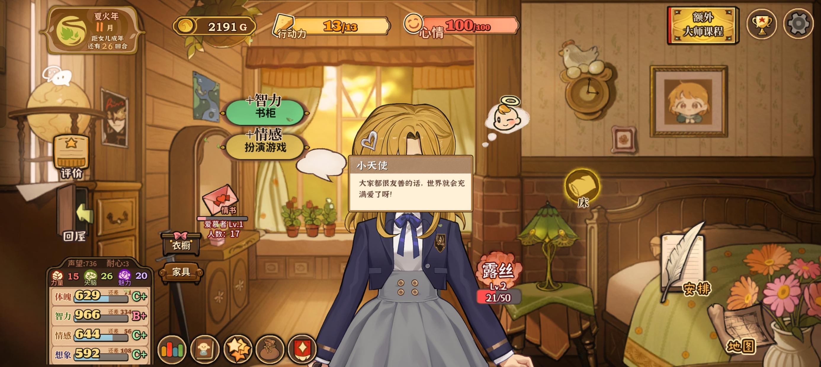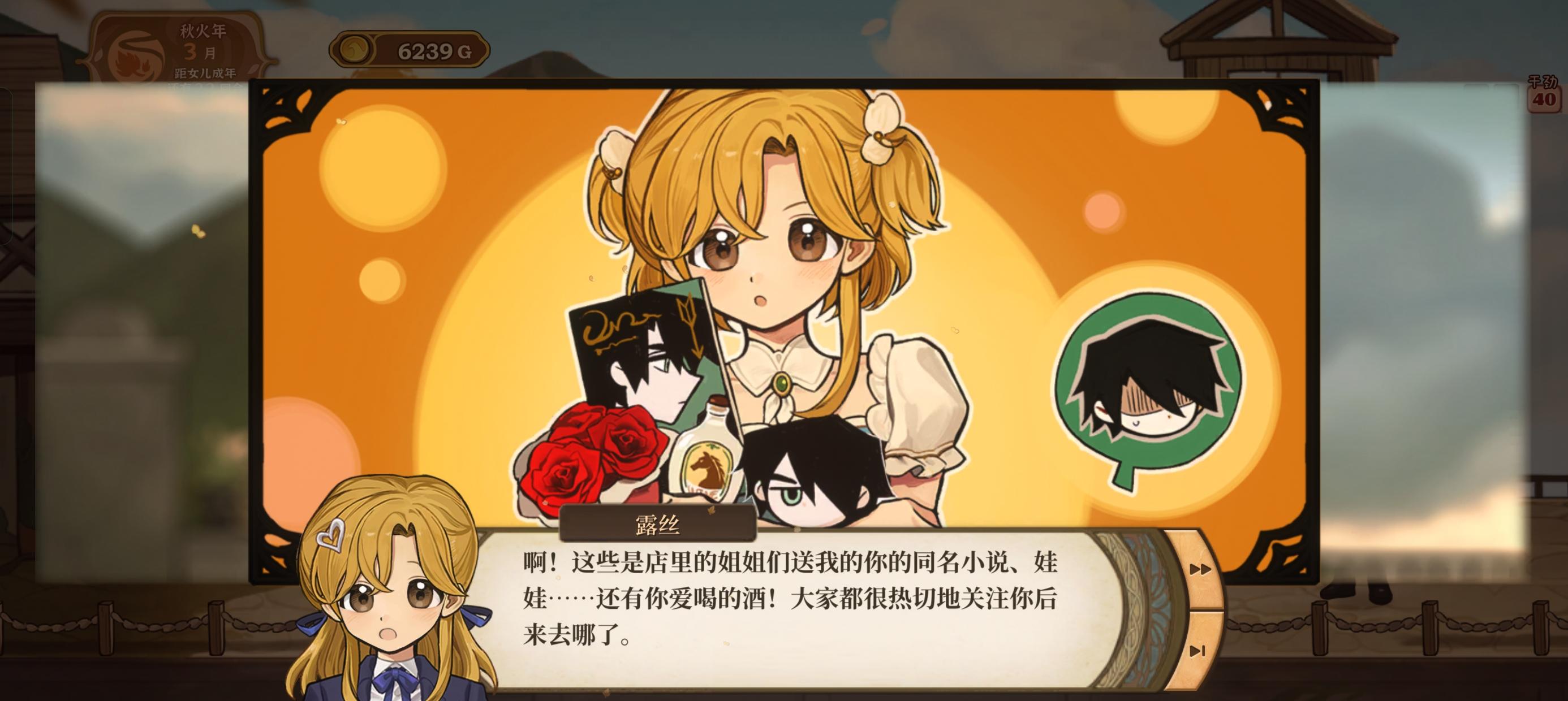 超级好玩的养女儿游戏,体量还超大。现在有了手机移植版,随时随地都可以拿出来玩。移植的适配做的不错,游玩过程中没有碰到什么问题。字体大小也比较易读。女儿超级可爱,一头金发,大大的棕色眼睛。还有超级可爱的部分配音。游戏里还有好多Q版的女儿简笔画,简直萌化了。开局的时候可以自由定义父亲和女儿的名字和生日。在游戏中两人生日的时候还会有特别的惊喜。游戏一共要历经春夏秋冬四个纪年总共48个回合,一直到把女儿养成年为止,游戏才会结束。打完一次就需要很久。游戏有很多的结局可以反复游玩,其中藏着很多秘密。游戏贴心的给了快进功能,可以帮助我们反复刷结局不管是手动存档还是自动存档,都只会从回合的开始记录,所以游戏在SL上是比较麻烦的。游戏里超级多的NPC角色。大家都有自己的故事线,互相之间还有各种复杂的联系。npc出场的时机是固定的,有些npc到后期才会出场。每个月报纸上的新闻也会刊登重要的大新闻。带着女儿一点点认识镇上的人,再到入学后结交同龄人朋友,和大家一点点的熟识起来,心里感觉特别温暖。镇上的大家都很好相处。女儿在旁边种地啊,烹饪之类的,旁边的朋友也会搭话。比如说女儿在烹饪,旁边的哈克特说他也想吃。我女儿的心情还变成了一个染了彩色头发的“万人迷”小人。女儿觉得所有人都可以当她的朋友,所有的朋友她都非常喜欢~看到这样自信的女儿,不善社交的老父亲真的很欣慰啊。要是现实社交也能像游戏这么简单就好了。游戏中有各种小游戏。像是每年六月小孩参加的小鸟节就有可以赚钱的幸运转盘比赛和算数小游戏比赛。不知道是不是错觉,感觉算术好像变简单了很多。遗忘森林里还有进行探险,也就是打经典的回合制战斗游戏。我们还可以邀请邀请成为探险伙伴的村民一起探险,每个人都有不同的武器和战斗技能。在港口可以进行赛马比赛、中央广场还有骰子游戏。骰子游戏教程说的不是很清楚,一定要把骰子放到台面上然后按下技能名才可以打出伤害。村子里有各种丰富多彩的活动可以参加,都可以增长女儿的见识。到后期这些活动会日渐丰富起来。一开始春的时候十几分钟就能打一局,到后来的季节一局要半小时左右了。战斗耗时比较长。与学习相关的有体魄、智力、情感、想象这四个数值。这些数值都可以通过需要消耗行动点来进行的活动来提升。还可以在课程的学习中获得提升。每个回合的结束都是由课程的安排来结束的。一共有五个空位可以安排,可以安排课程学习,也可以劳逸结合的让女儿和朋友们一起出去玩。不管是平常和女儿的交流谈心还是在镇上和人聊天,都会有很多让爸爸来回答的问题。不同的回答会获得女儿不同的评价。要成为女儿心目中的好爸爸可真不容易呢。要言传身教才能把女儿培养成才。