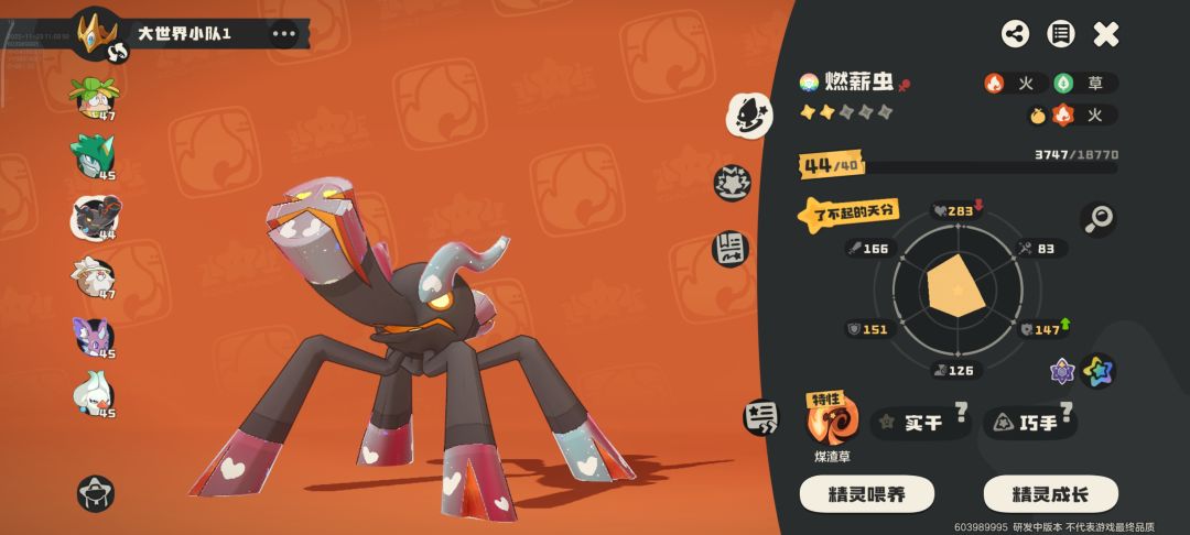 之后我就一直纠结选哪个,但是我能屈服吗?我哪个都不选。直接找攻略,说“燃薪虫”厉害,但是获得难度极极极极极极极极大,需要刷“噩梦精灵”(特殊精灵),这玩意出的概率是随机的(你每抓一个精灵大世界就有概率刷出一个特殊精灵,还有可能是异色😍,但是我没刷出过异色)。这下好了足足200多个球才出了一只“燃薪虫”,我马上用那个最高级的球抓(最高级的球忘了叫啥了,但是用它可以提高精灵的各种属性自己还是100%炫彩),炫彩还是我比较喜欢的颜色(下面有图片),也是用它越级打领主10多级的差距也是直接秒。