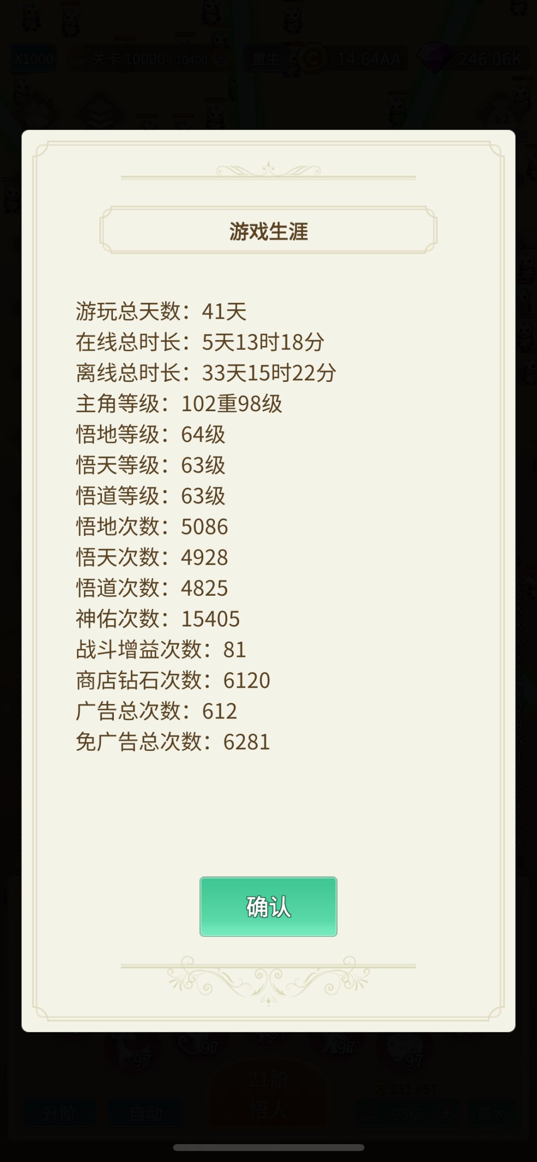 两张图片可以看到大部分信息,针对这样的游戏玩了40天,在线时间5天半,我也算是努力的了!每天除了10多分钟看广告,就是等不忙的时候上线收一波收益,然后去和boss决斗。然后重生,再花20分钟,继续刷钱。现在100级过了,就是每天等着看广告了,不看广子就没提升!没有攻略,没有心得。总结就是新手每天18个广子,20天后每天12个广子(广告不是你想有,想有就能有的!!)
