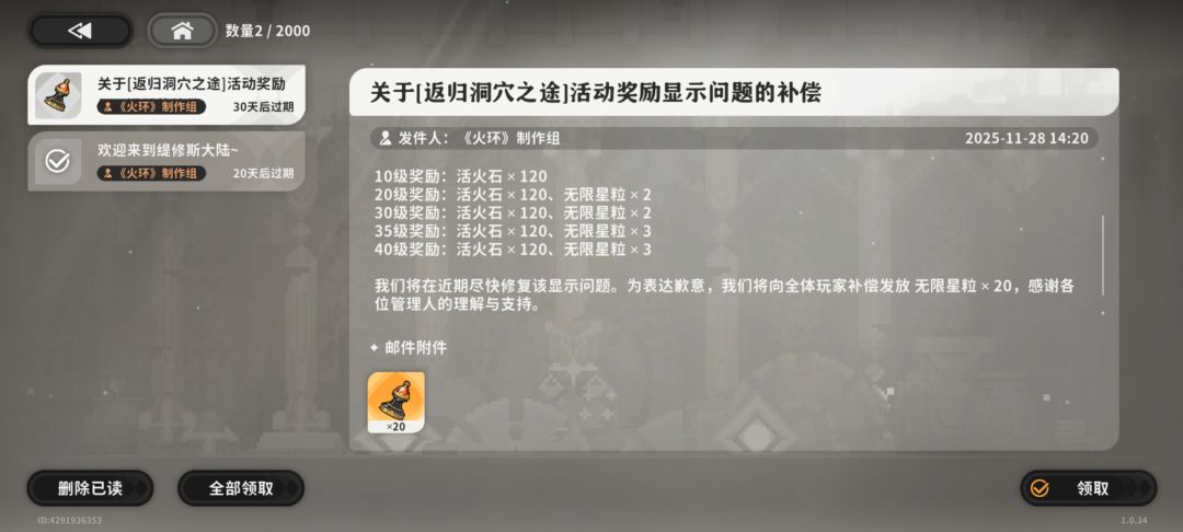 那个40级领40抽的福利官方亲自澄清了是显示错误。实际上是40级10抽。我补个图吧。另外邮件补偿了20抽,也就是说总共30抽,比我一开始说的还减了10抽。官方牛b,这评分还是太高了。