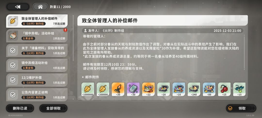 12.3号晚上官方已经滑跪发补偿。30抽和0到40级养成全材料。这次是官方有史以来最出血的一次。但需要注意补偿仅到12.8号,只有5天时间。附图。