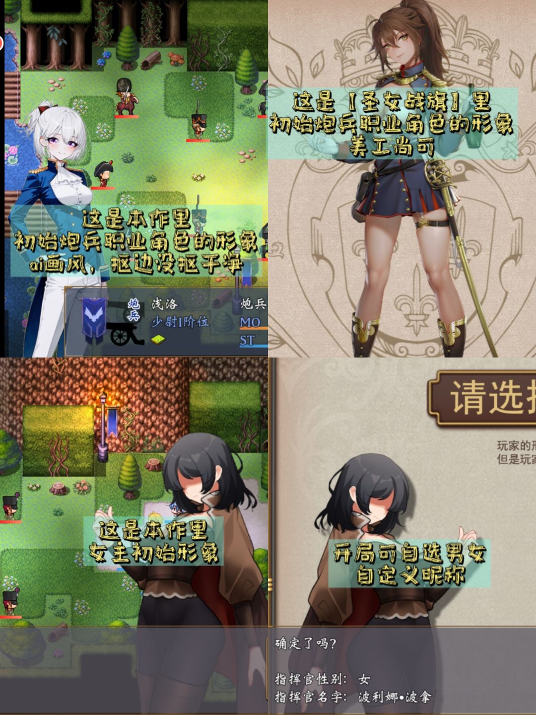 同时,更怒其不争的就是,要知道《圣女战旗》真正的缺陷就是玩法内容、真正的优势反而是美工与柰子,其次是剧情与人设,但作为延续玩法架构、选用rpgmaker配以ai图作角色立绘的本作来说,美工是真的零作用了。