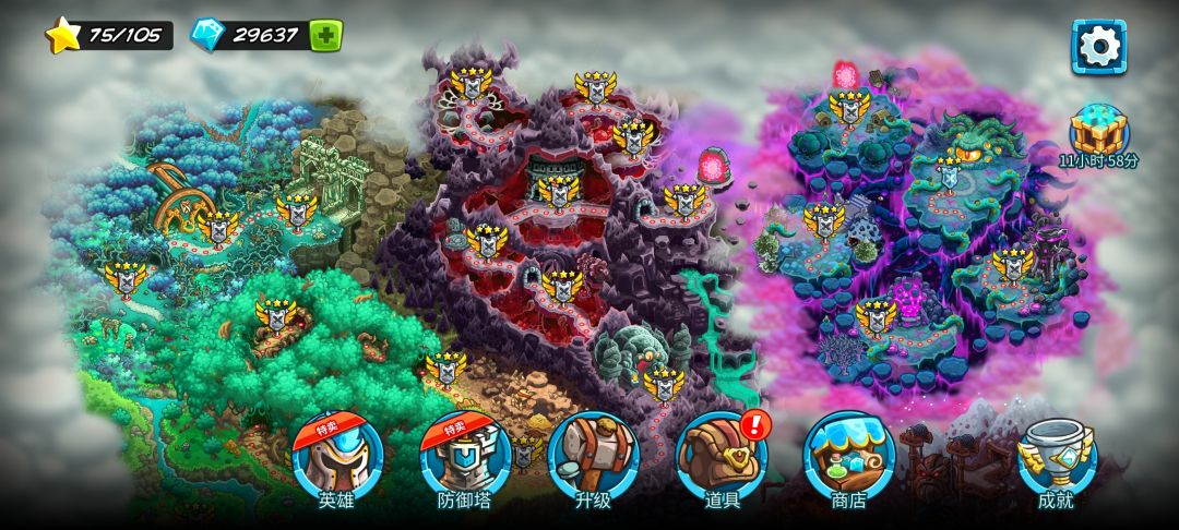 免费关卡已经全部完成了~因为一开始没有解锁不可能模式所以主线的普通老兵钢铁第一遍都是打的老兵模式,目前正在用不可能模式重推怎么说呢,感觉不参与活动之类的话只用免费英雄免费塔会有点难吧……我有参与活动拿到的不少英雄和塔比较难的几关都得试好几次,换各种塔尝试不同的策略,嘛虽然打不过有道具就是了~总之还不错吧~嗯