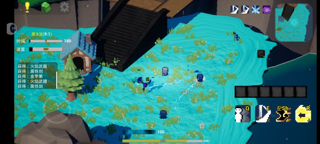 玩法只有一种,战斗以波次进行,不知道要打多少波,似乎是无尽模式,每一波的战斗强度有所提升,会越来越难。场景空间很有限,在一个悬崖小岛上,掉下去会损失生命值,直至挂掉。
