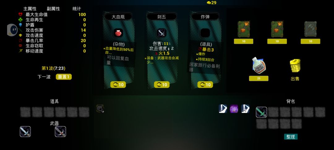 单机动作肉鸽游戏,战斗部分有点像土豆兄弟,但武器槽位并没有那么多,可能受角色属性影响,或功能完成度问题,第一个角色可用武器只有两把。战斗攻击是全自动进行的,手动单手指控制摇杆走位即可,打完一波之后手动点击下一波和继续,也有肉鸽金币统筹策略和商店功能。