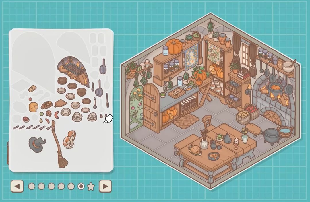 经过了亲自上手贴贴纸的解压环节,那我们就要来找找每个小角落中存在的隐藏贴纸了,这些贴纸不是直接被放在贴纸页面之中的,它们的解锁方式很巧妙,我们可以通过在主界面上查看每个贴纸上游戏所给的提示注释,来尝试通过不同的贴纸组合进行解锁,像是女巫的黑猫,那就可以去尝试扫帚搭配上巫师帽的组合,一碗热腾腾的汤可能就是要在正在燃烧的壁炉上贴上用来炖煮的汤锅等等。这些类似小彩蛋的设计为整体的游戏可玩性又增色了不少,在解压的过程中玩一些不一样的小花样也是一种挺不错的选择。