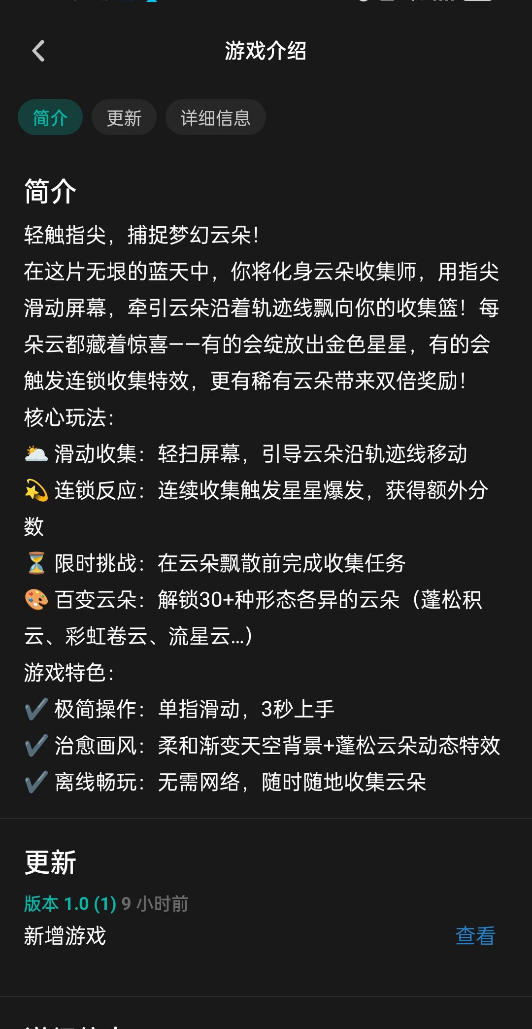 很粗糙的不知道在干啥的点点点小游戏(1.0(1)版本)你看得分56时这个蓝色的云,它摆明了就是一张甚至左边没擦干净有一道黑的正方形透明背景图片就纯是长不一样的云从下往上飘,点就完事了,也没有简洁的滑动收集啊什么的,到一百多分也没有玩法上的变化,速度变化不清楚是压根就没有还是很不明显,所谓连击触发的效果也没有,更没有BGM什么的我寻思支付宝收集能量雨还能种树呢,这个小游戏更像半成品吧,需要加入更多元素,无论是玩法、剧情还是别的什么