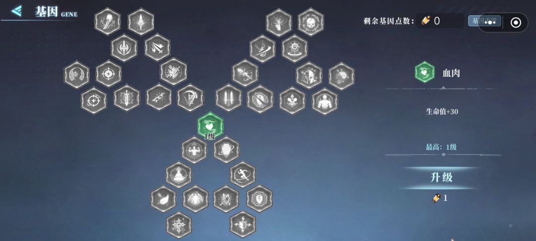 基因升级类似天赋树功能,点数获得非常有限,获取途径也有些模糊,提示给与的印象不深。基因可以直接增加基础属性,有投点策略和倾向。