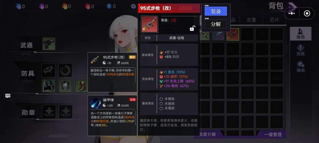 养成以装备为主,同品质的装备也有词条差异化,弄一件好词条的并不容易,捡高品质的用即可。全身槽位包括一把武器,五件装备,两个勋章和一个称号。每件装备都有品级差别,凑齐一身红装并不太容易。
