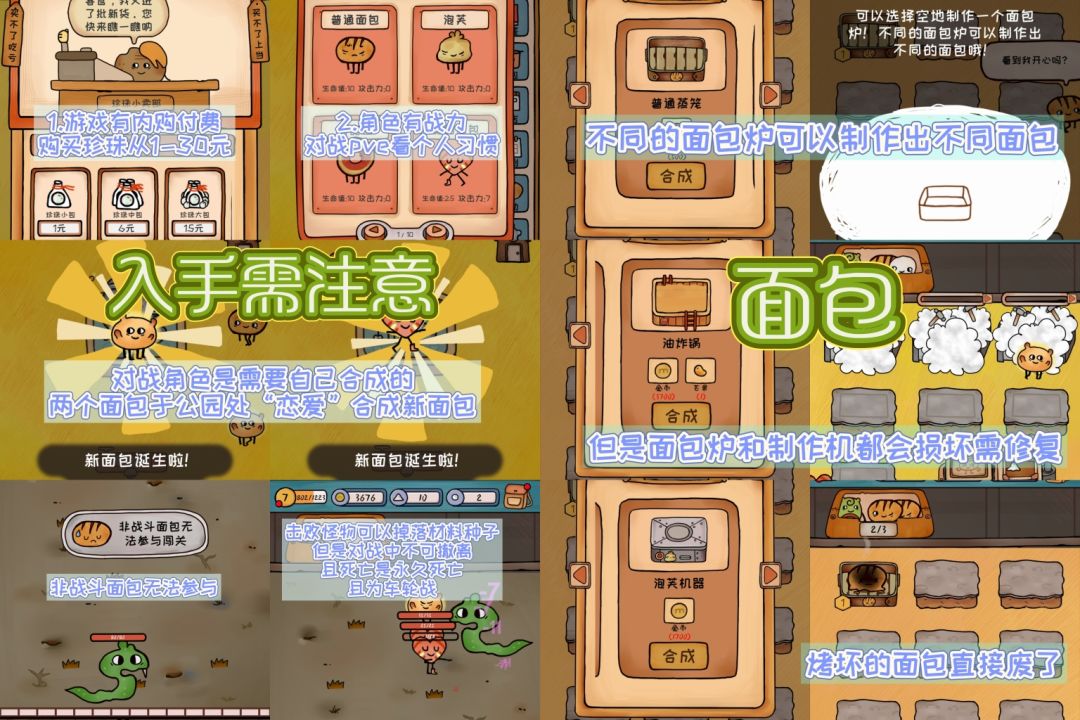 在战斗流程里,步骤更多了,因为普通的面包是无法进入战斗关卡的,想要面包用来战斗、必须于公园里用两个面包合成,而且合成的结果也是不确定的,但可以攒出一定数量的面包、再来抱团剿灭怪物;不过需要注意的是,怪物是车轮战、且对战过程中无法撤出,一旦面包死了、就是死了,而且掉落物的种子还需要种植、收货后才能进行售卖。