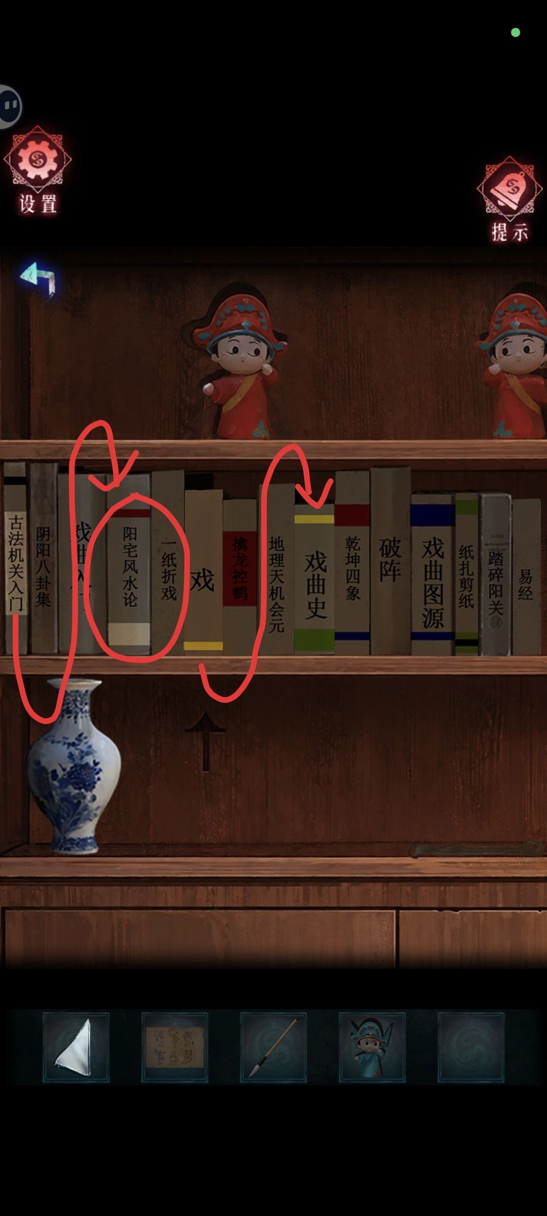 绝大多数解密都挺有意思的。但是如图一,这种对照的点灯和放珠子,我对着答案看都没看懂到底是怎么点灯的,这个实在太没逻辑了。还有图二,《阳宅风水论》是不是画错颜色了,前面的书都是颜色相接,头尾相连。这本书变成了尾尾相连。剧情是关于永生的话题,还可以,整体人物塑造都不错的,就是剧情推动太硬核了。而且班主既然有一个能存灵气的地方,为什么要放走林梦,然后为了换场景,林梦与师姐对话太尬了。但是画面,场景,配音都挺好的,推荐一玩。