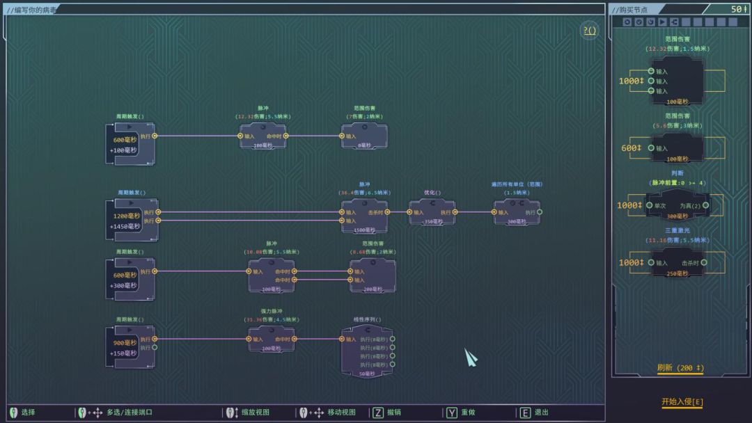 前期开荒可以考虑围绕低CD和多重分裂的模块进行编程,低难度下伤害虽然一般,但攻击频率高,范围广,基本都可以过。之后的高难度则可以在有多个输出节点跟高伤害单节点的情况下,除了增加输出外,也可以在触发器节点的循环中加一个玩家协议。
