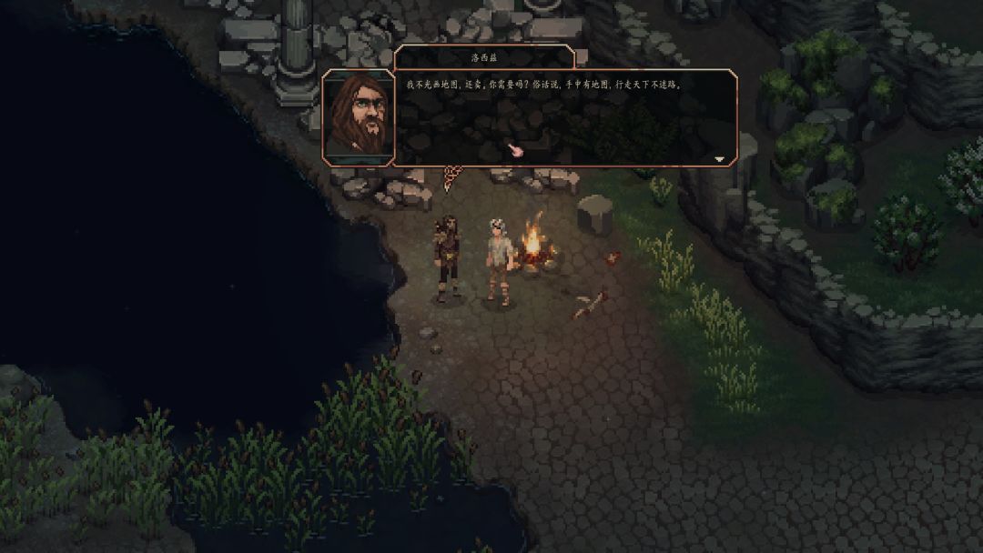 游戏是开放世界大地图,虽然有章节划分,但是地图之间没有明显的阻隔,当然有些怪物遍布的区域你能硬闯过去也是可以的,不过地图的体量没有特别大,毕竟游戏只是个独立游戏的体量,不过还是能玩很长时间的,而且因为任务设计以及阵营选择的问题,有着反复游玩的价值,也可以挑战更高难度更有代入感。游戏的地图会提供一个大概的位置,最开始会获得一个粗糙地图,在伐木工营地西边会遇到一个制图师,获得更详细清晰的地图。但是任务目标不会自动标记出来,我们需要根据npc的口述通过大致的方位自行判断,不过这个虽然有点老式rpg的感觉,但因为是2D游戏,所以在几遍跑图之后就熟悉了,不会怎么迷路。此外游戏推进到一定章节会要求玩家选择一个阵营加入,主线两个阵营遗族营地阵营和奈米顿阵营有着相互矛盾的目标,所以后续的选择也至关重要。两大阵营以外,其他小部落也是有着非常有趣的任务。