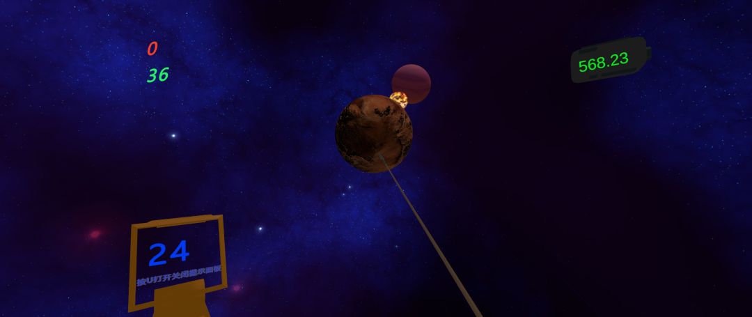 3D空间建模,场景给人的视觉纵深很好,空间立体感强,可以感受到宇宙的广阔无垠,也能看到游戏场景的相对边界。看不到自身是什么模样,只能看到丢出去的陨石特效,战斗表现很普通,没什么看点和打击感。可以打开音乐,一边听音乐一边赶路,体验到也还行。
